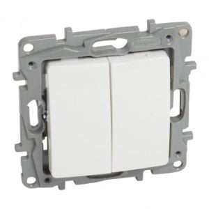 Двоен обичен прекинувач 10A бела боја комплет со подлошка за вградена монтажа во дозна